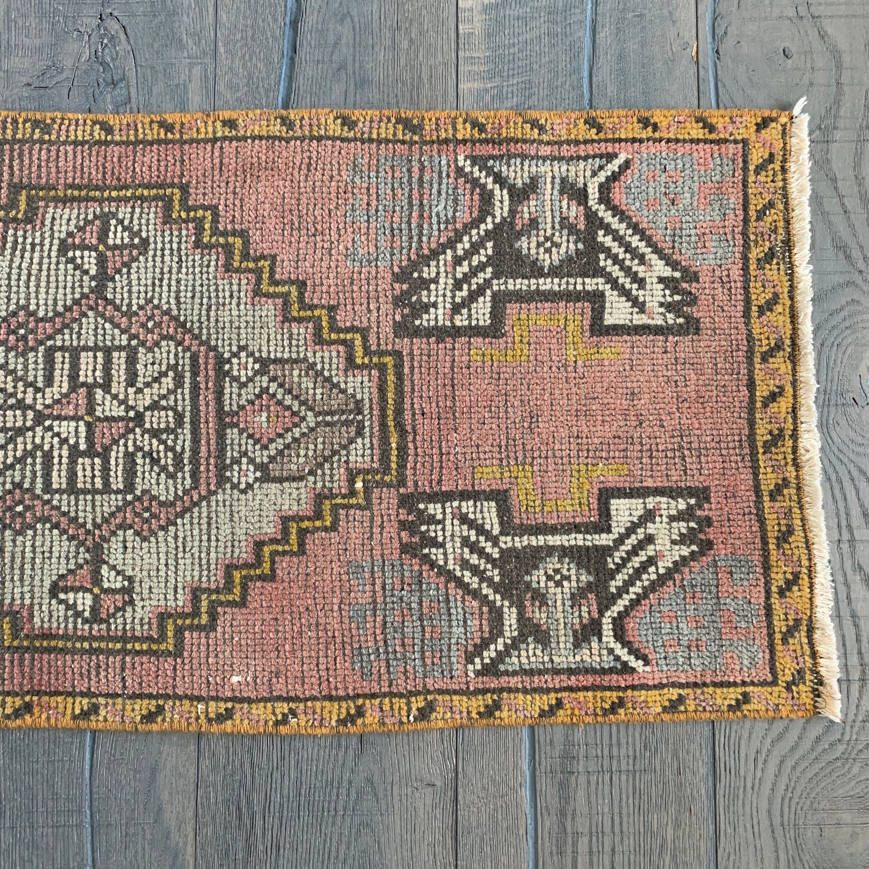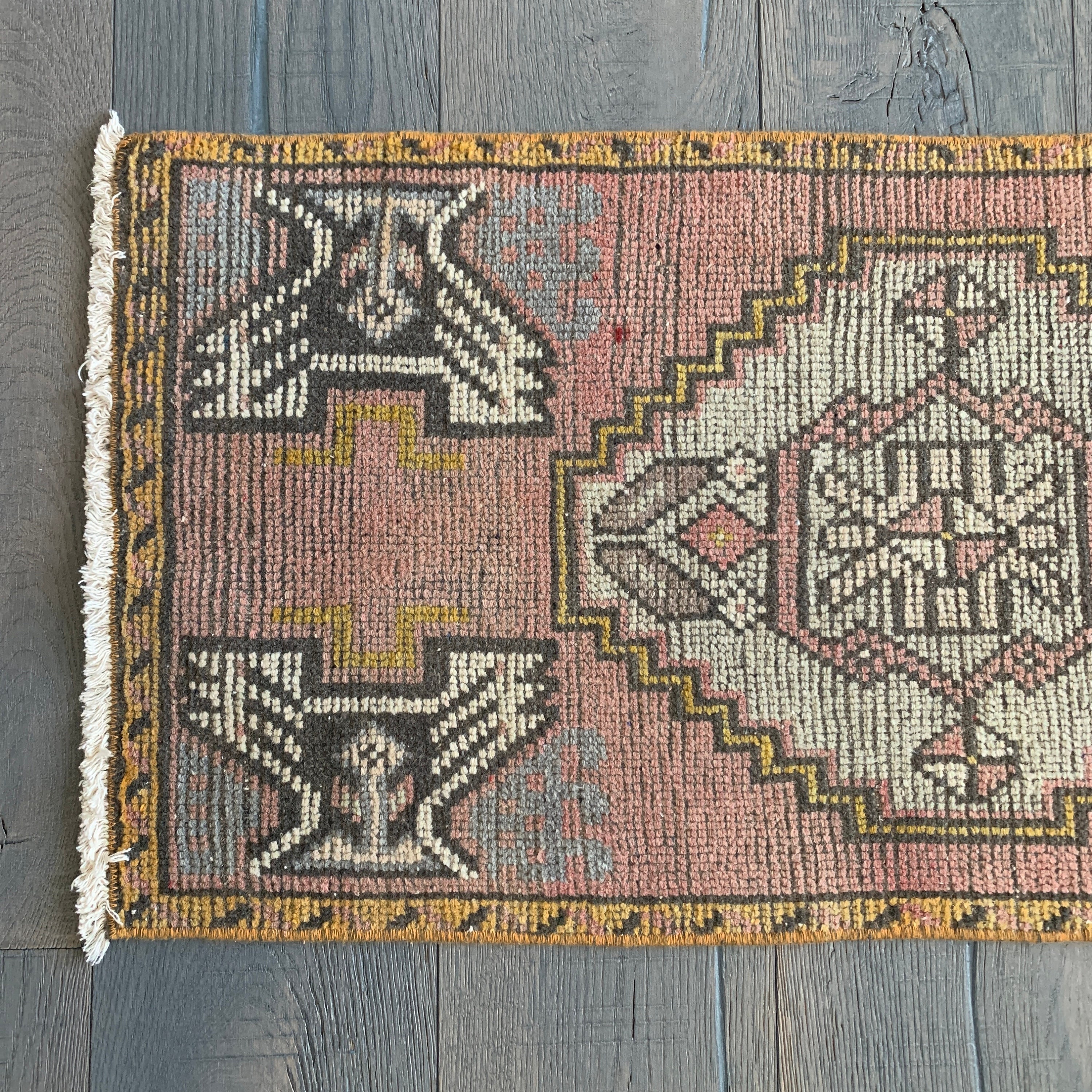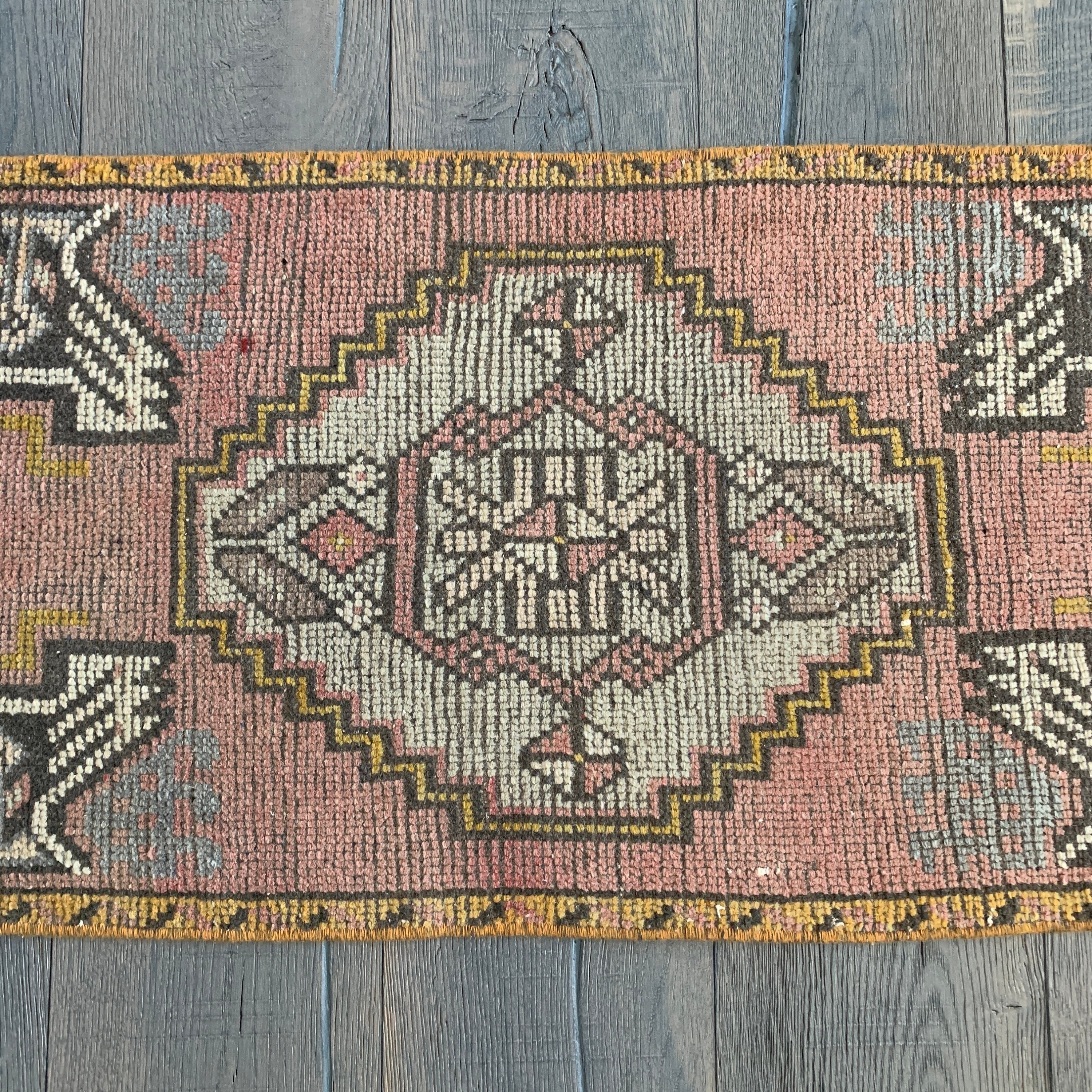 All the love for this mini vintage Turkish rug! Our mini rugs are vintage, one-of-a-kind textiles made between 1940-1960. This rug was hand-knotted with 100% wool fibres, and has the loveliest colours - vintage rugs fade beautifully with wear. Mini rugs have the perfect muted colourways - each one is a stunner!