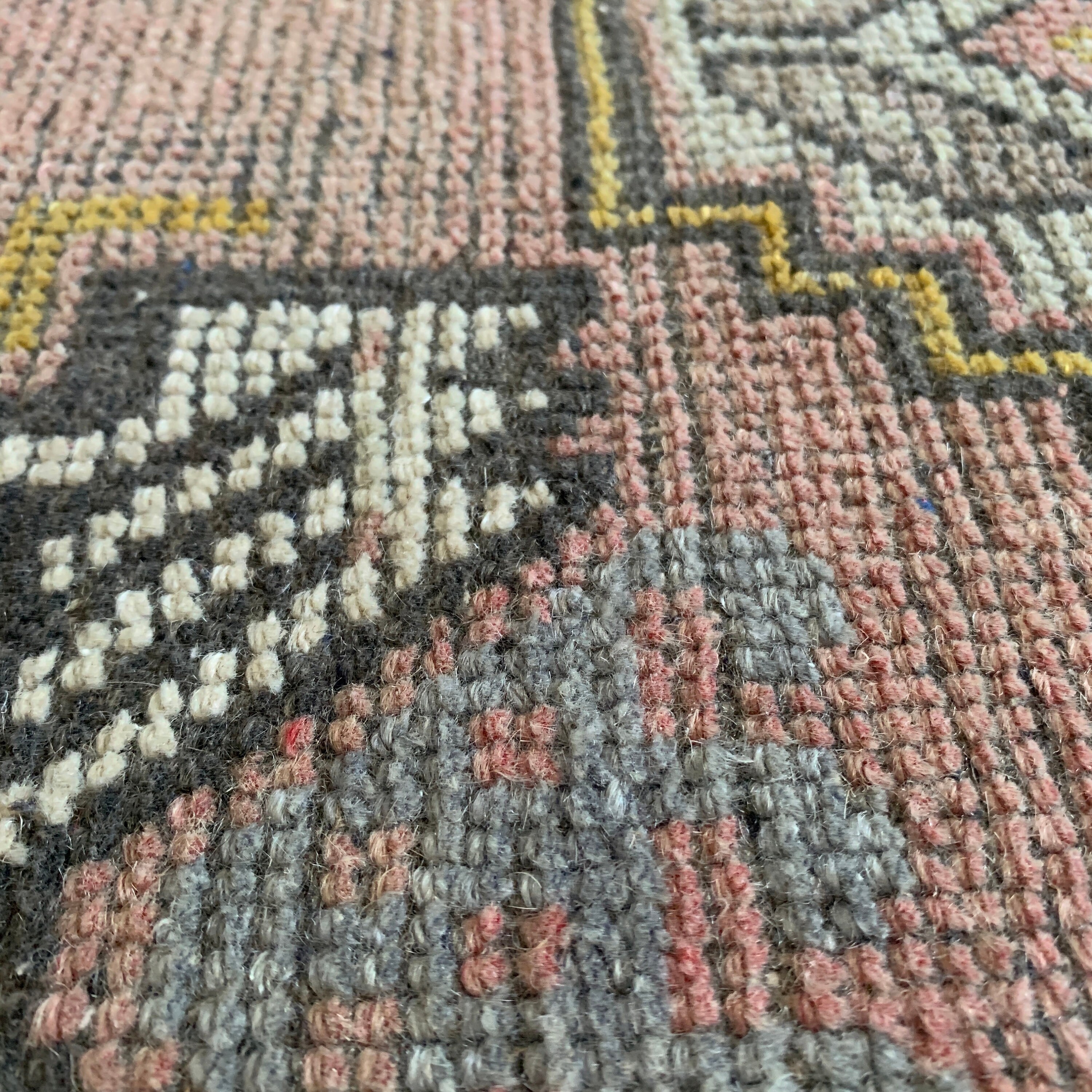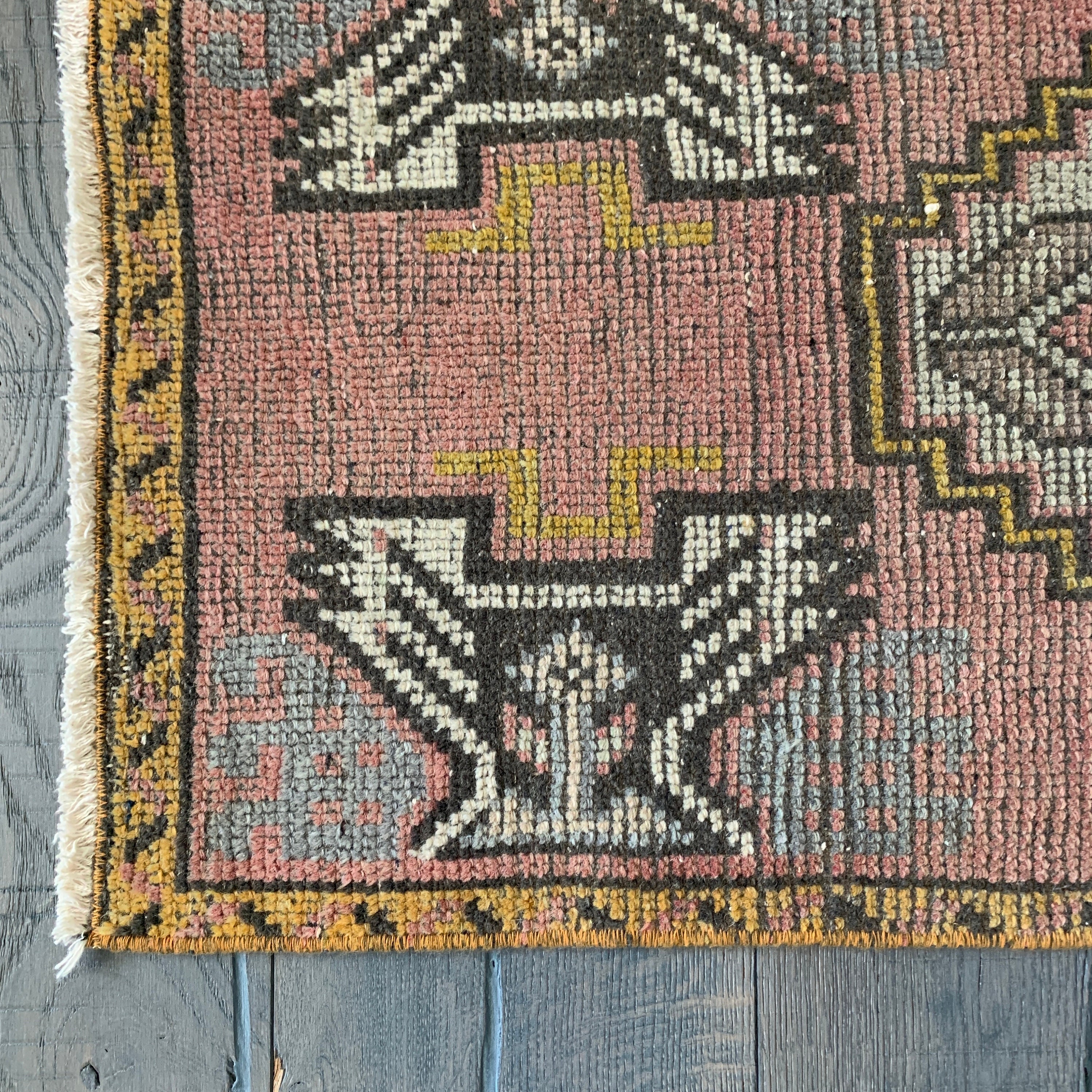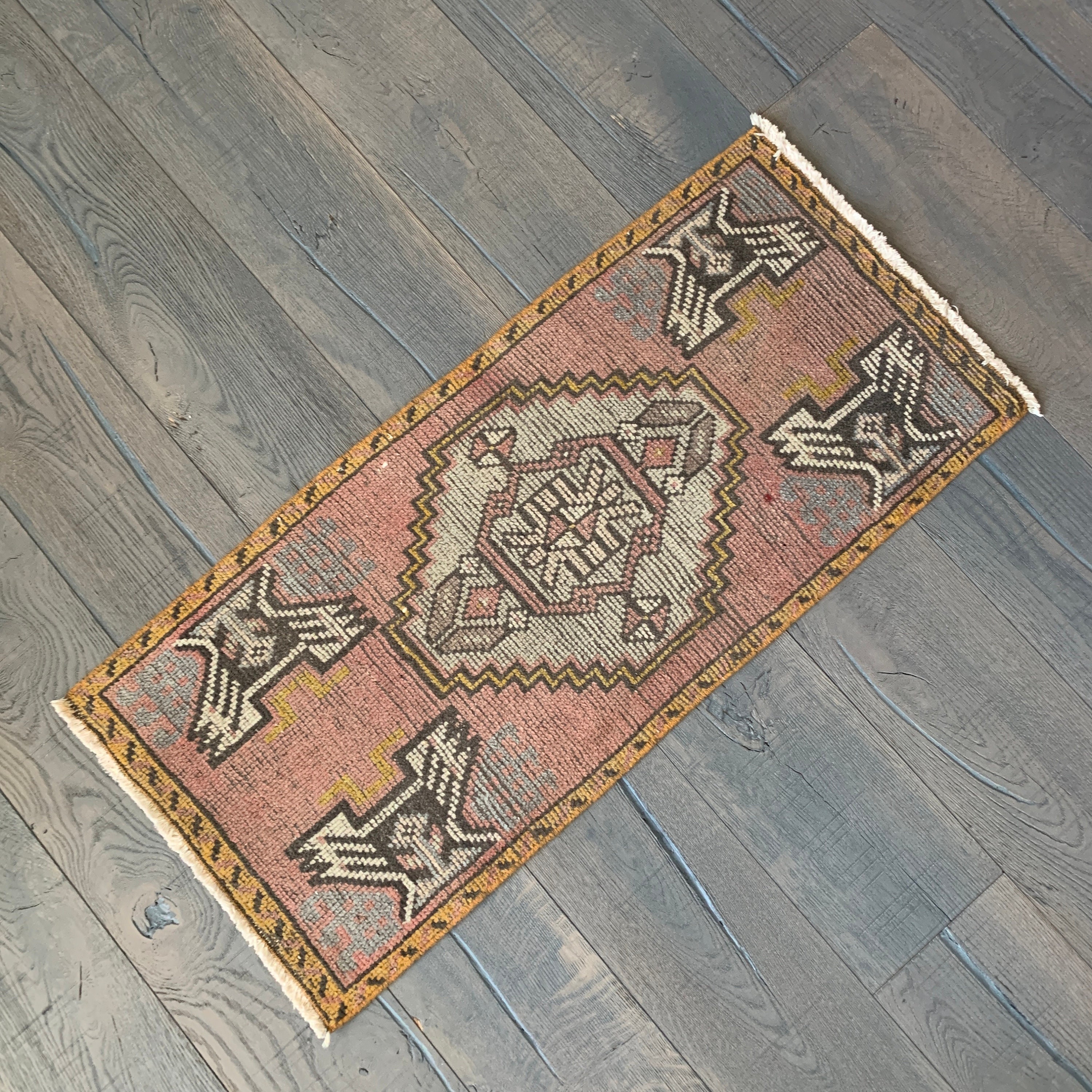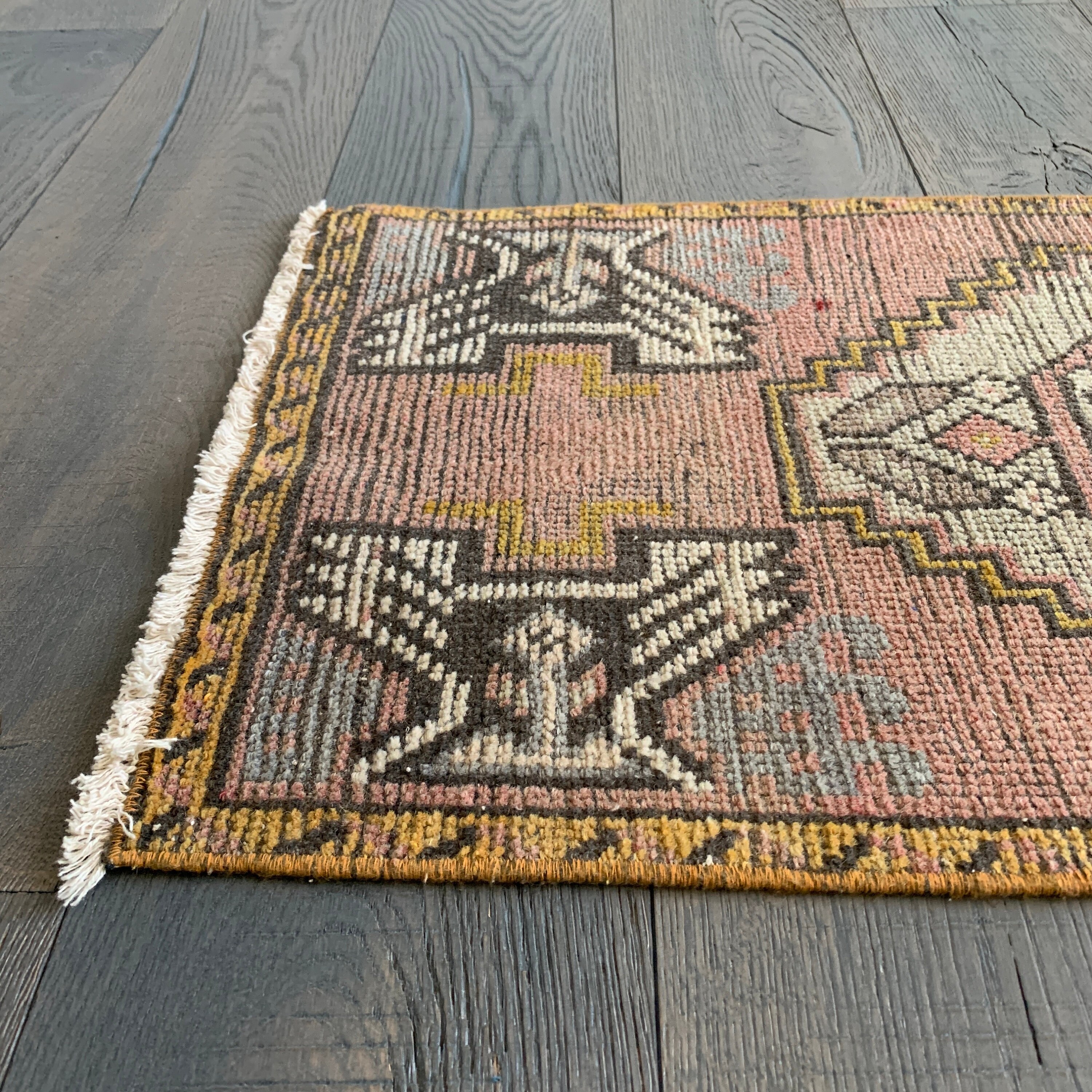 All the love for this mini vintage Turkish rug! Our mini rugs are vintage, one-of-a-kind textiles made between 1940-1960. This rug was hand-knotted with 100% wool fibres, and has the loveliest colours - vintage rugs fade beautifully with wear. Mini rugs have the perfect muted colourways - each one is a stunner!
