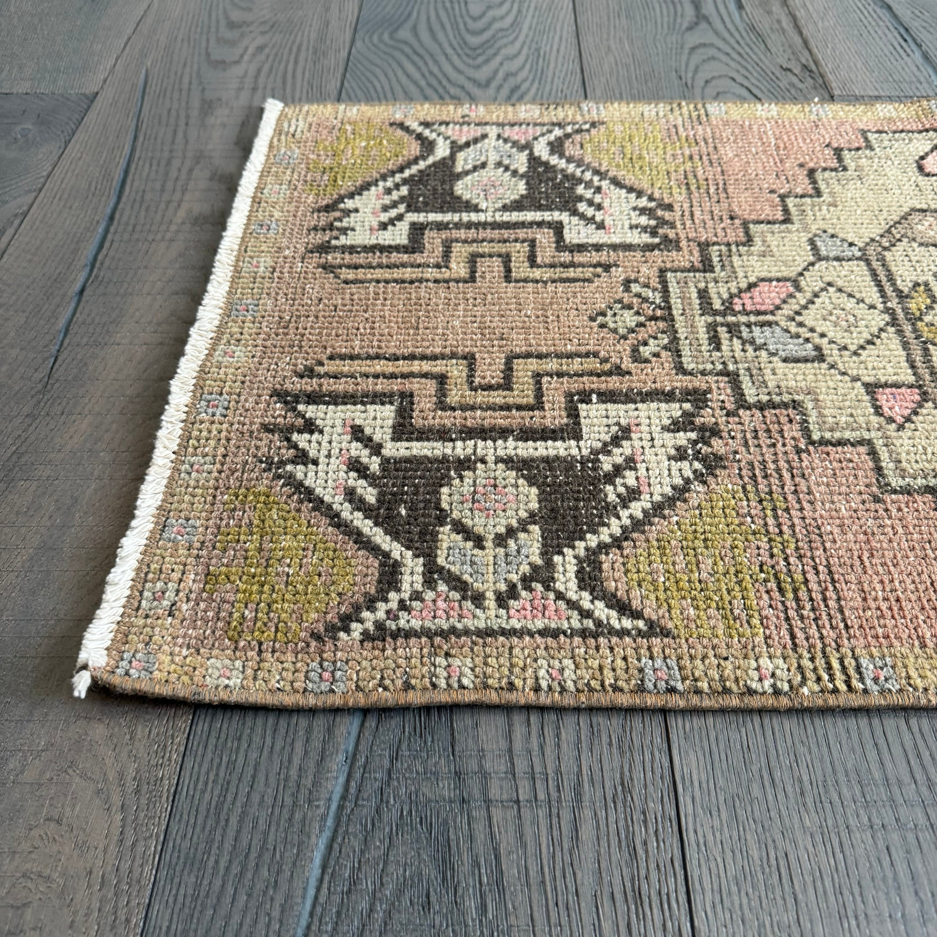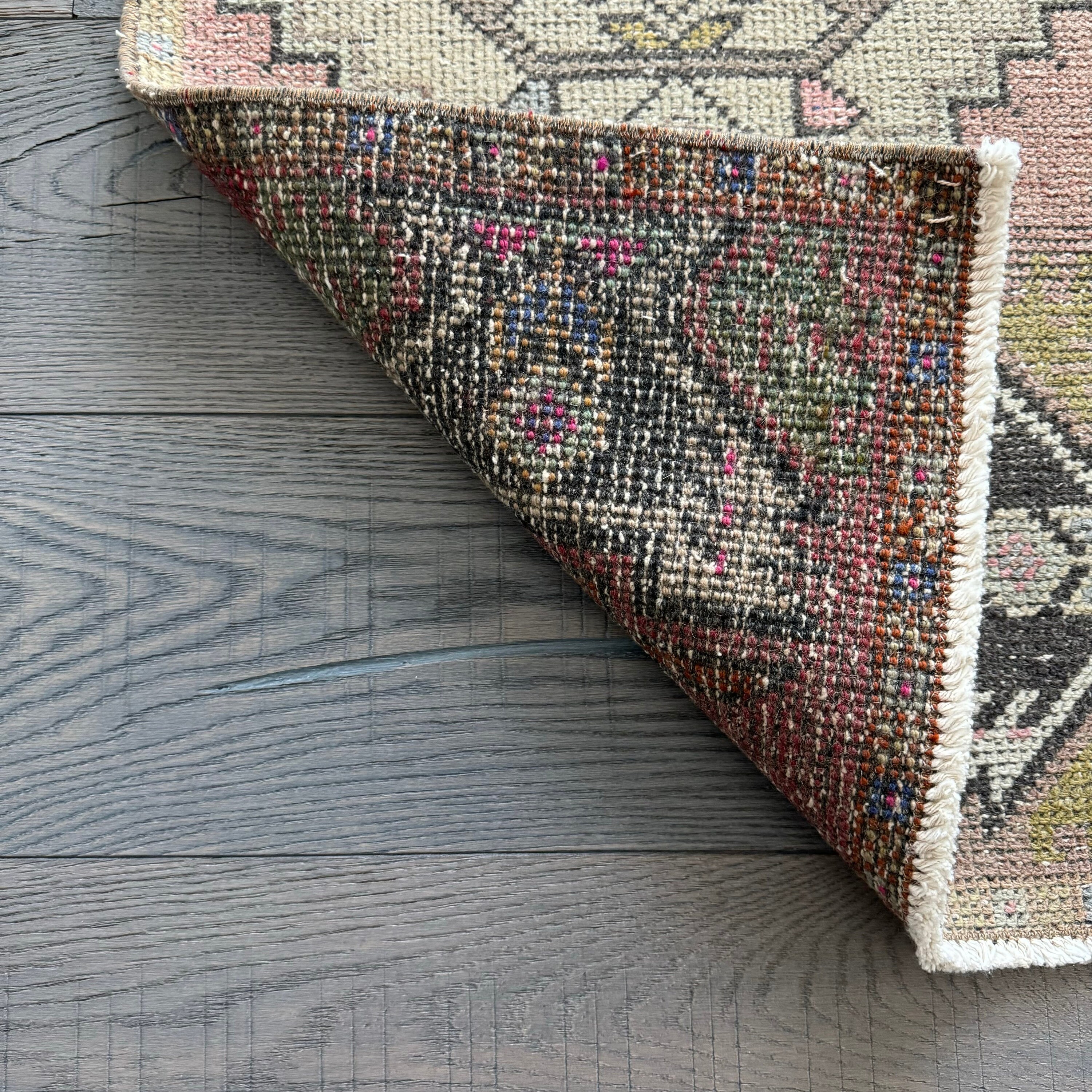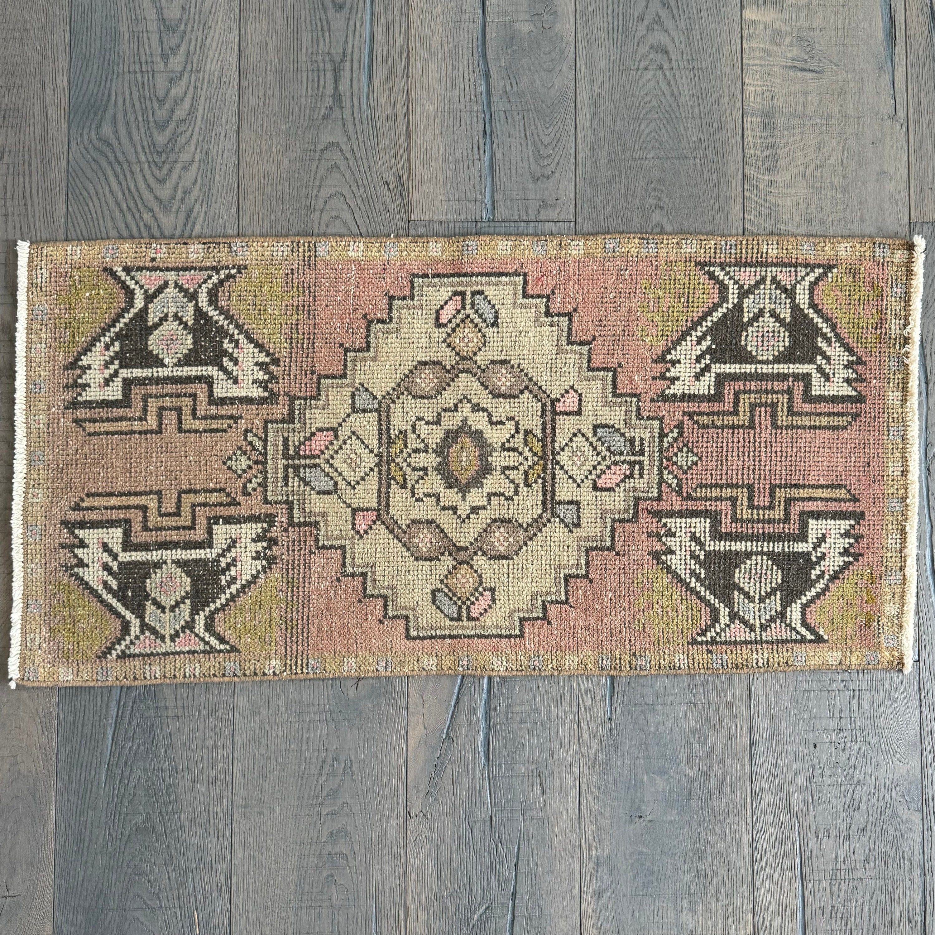 Our mini rugs are vintage, one-of-a-kind textiles made between 1940-1960. This rug was hand-knotted with 100% wool fibres, and has the loveliest colours - vintage rugs fade beautifully with wear. Mini rugs have the perfect muted colourways - each one is a stunner!