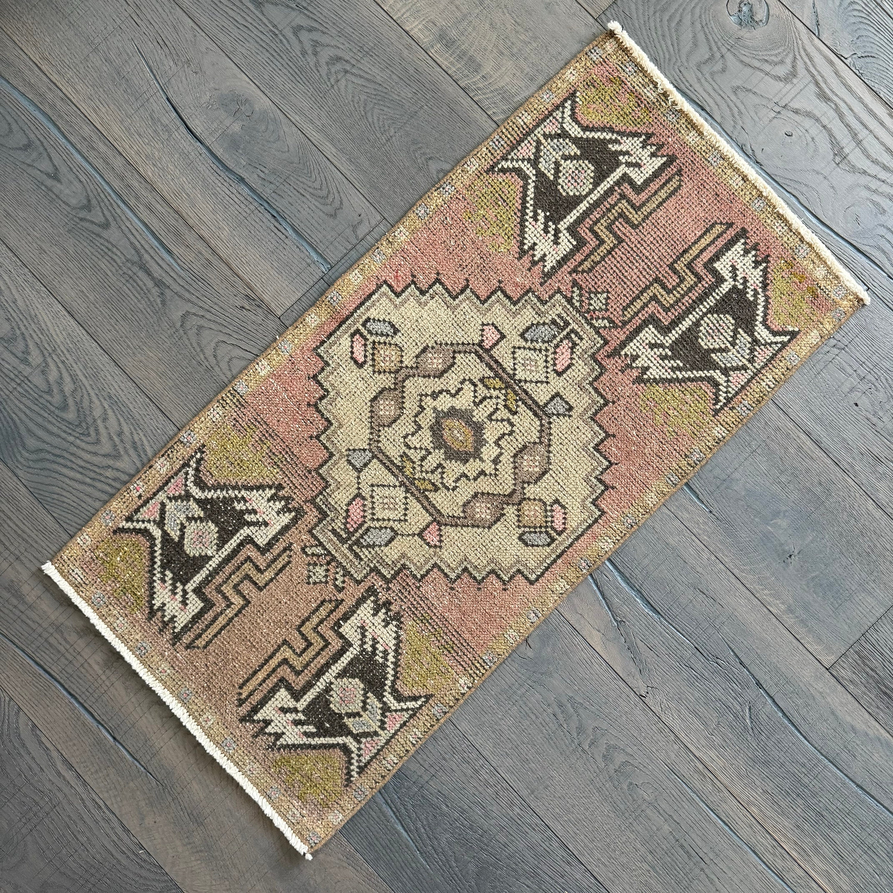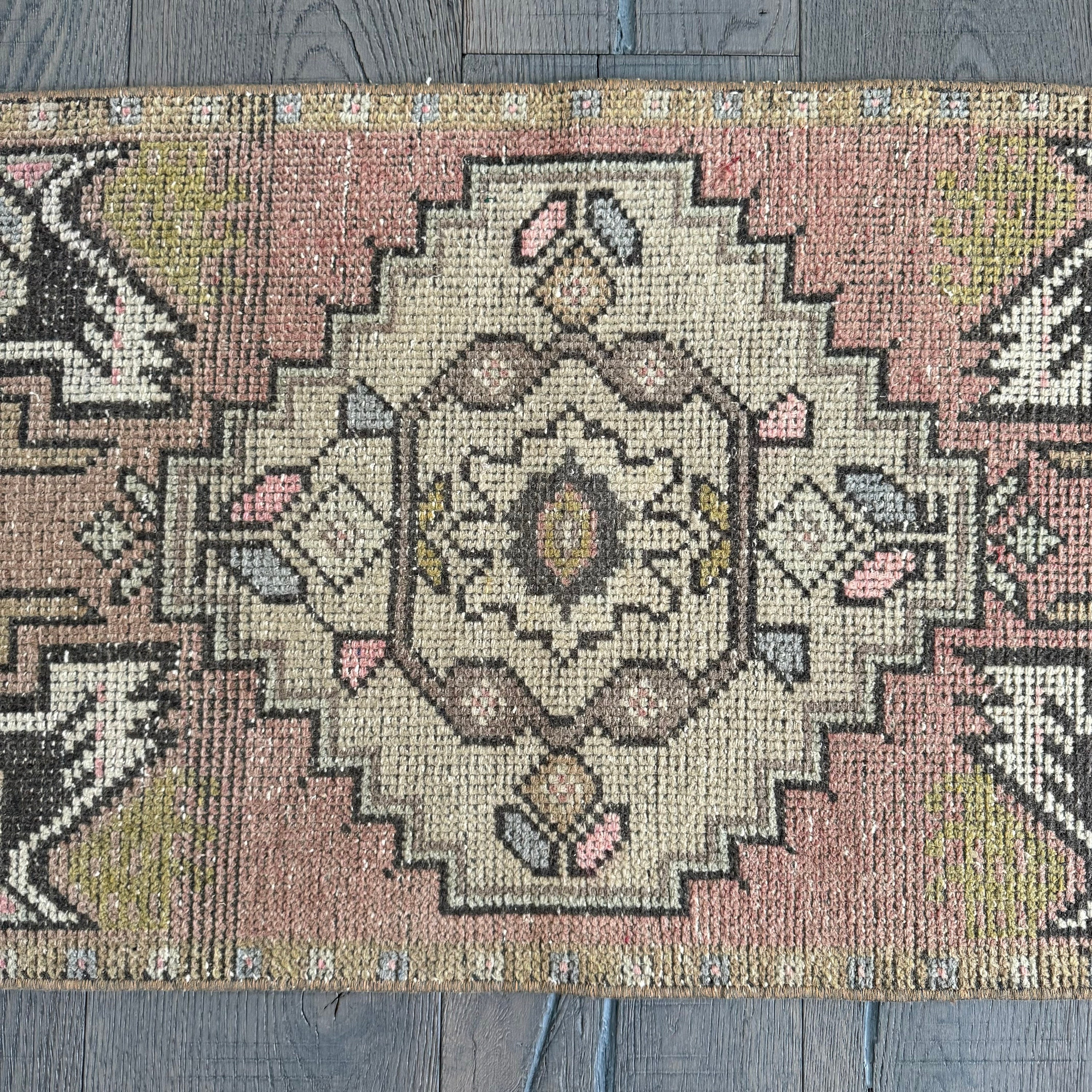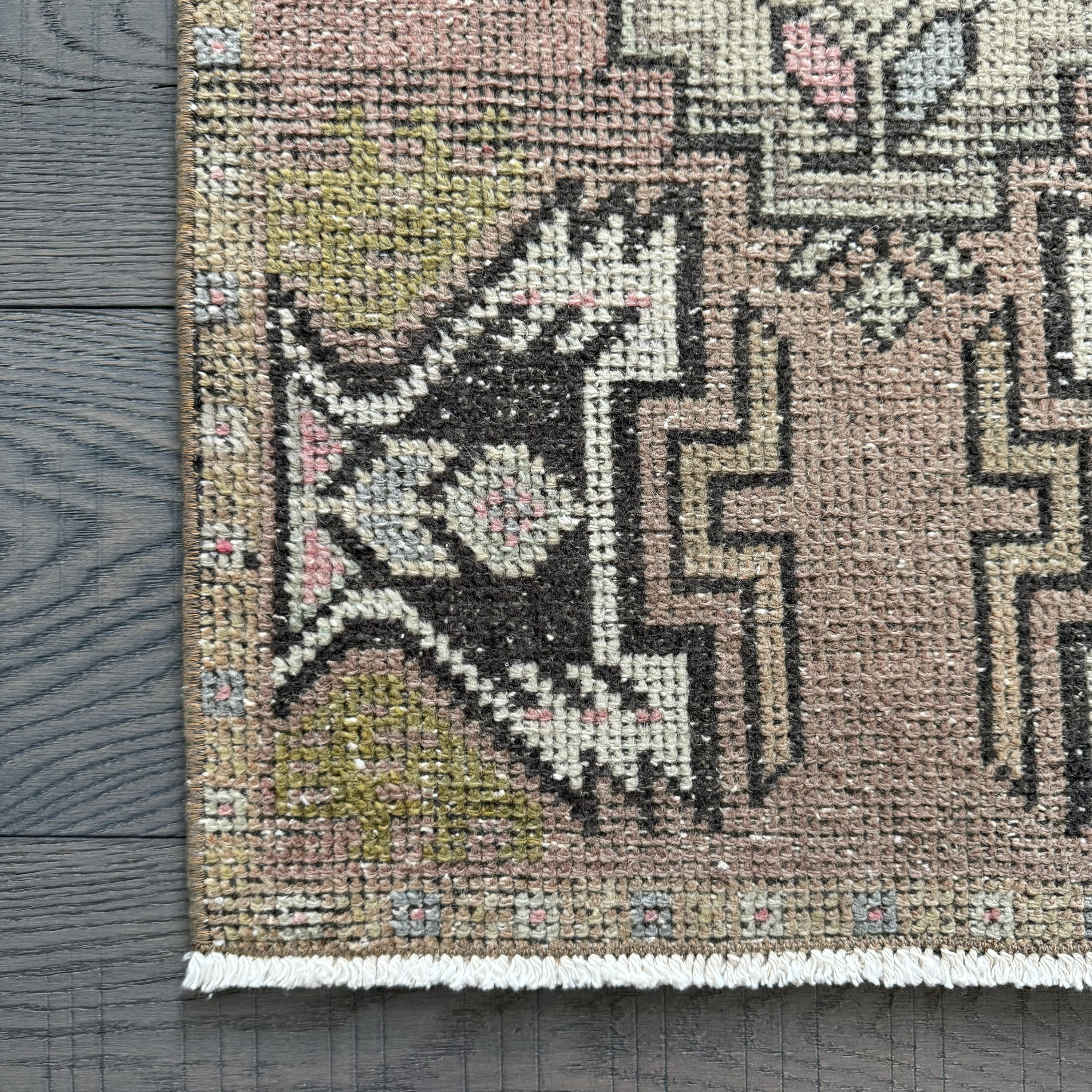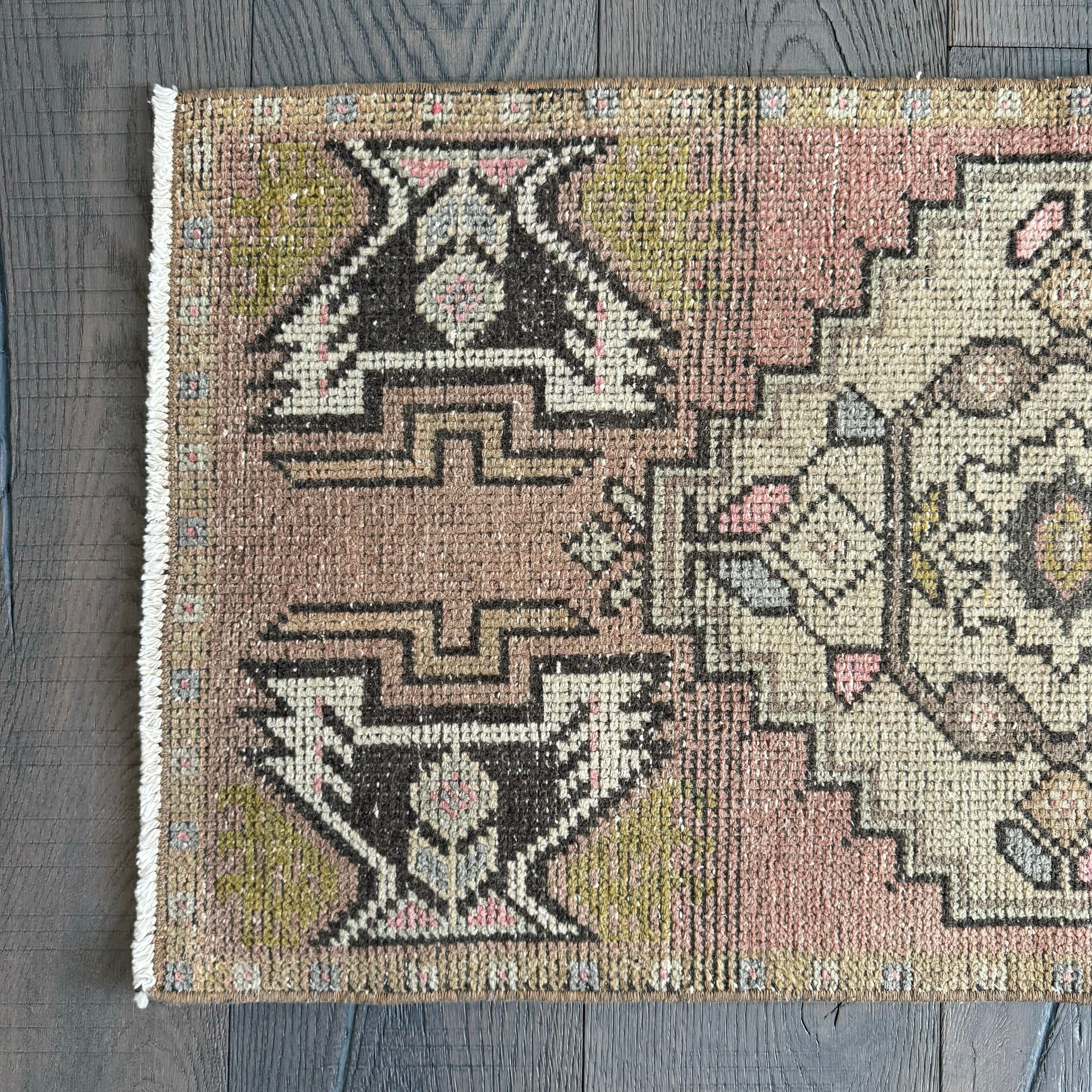 Our mini rugs are vintage, one-of-a-kind textiles made between 1940-1960. This rug was hand-knotted with 100% wool fibres, and has the loveliest colours - vintage rugs fade beautifully with wear. Mini rugs have the perfect muted colourways - each one is a stunner!